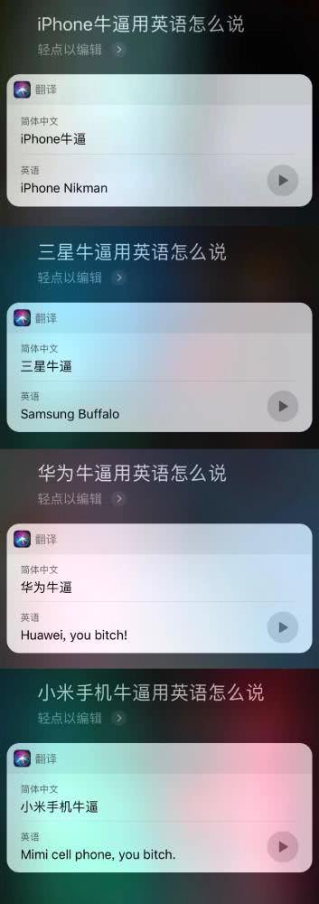 網(wǎng)友測試發(fā)現,當向蘋(píng)果siri提問(wèn)“華為牛逼用英語(yǔ)怎么說(shuō)”,Siri將其翻譯成“Huawei,you bitch”。當把主語(yǔ)換成小米時(shí),也會(huì )出現“you bitch”內容。而當主語(yǔ)換成蘋(píng)果時(shí),翻譯為:Apple is so awesome。